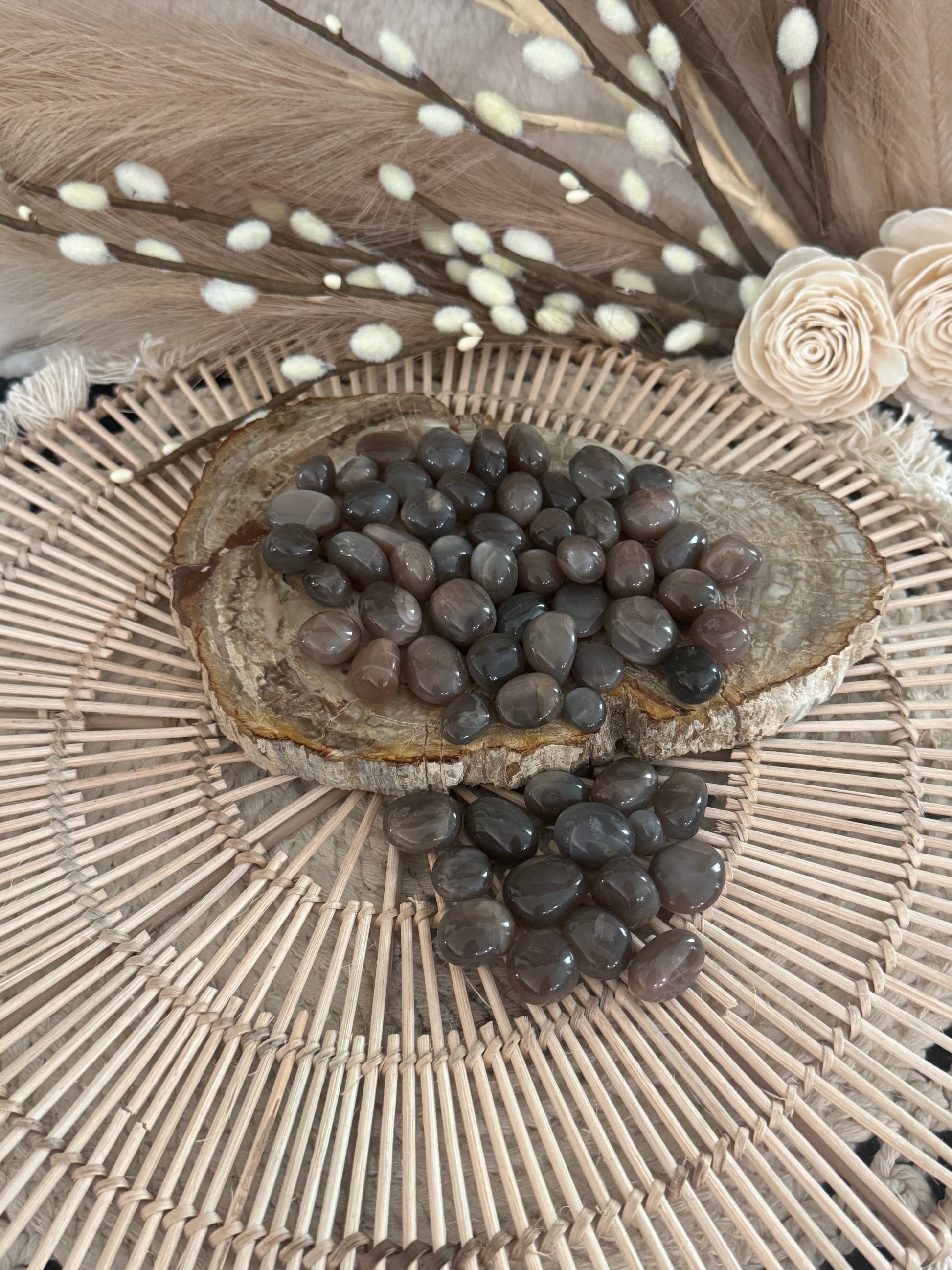 Black Moonstone resonates with the Sacral Chakra, where emotional and hormonal energies are stored, and the Root Chakra, providing grounding and safety during times of transition. It also stimulates the Third Eye Chakra, enhancing intuition and inner knowing.