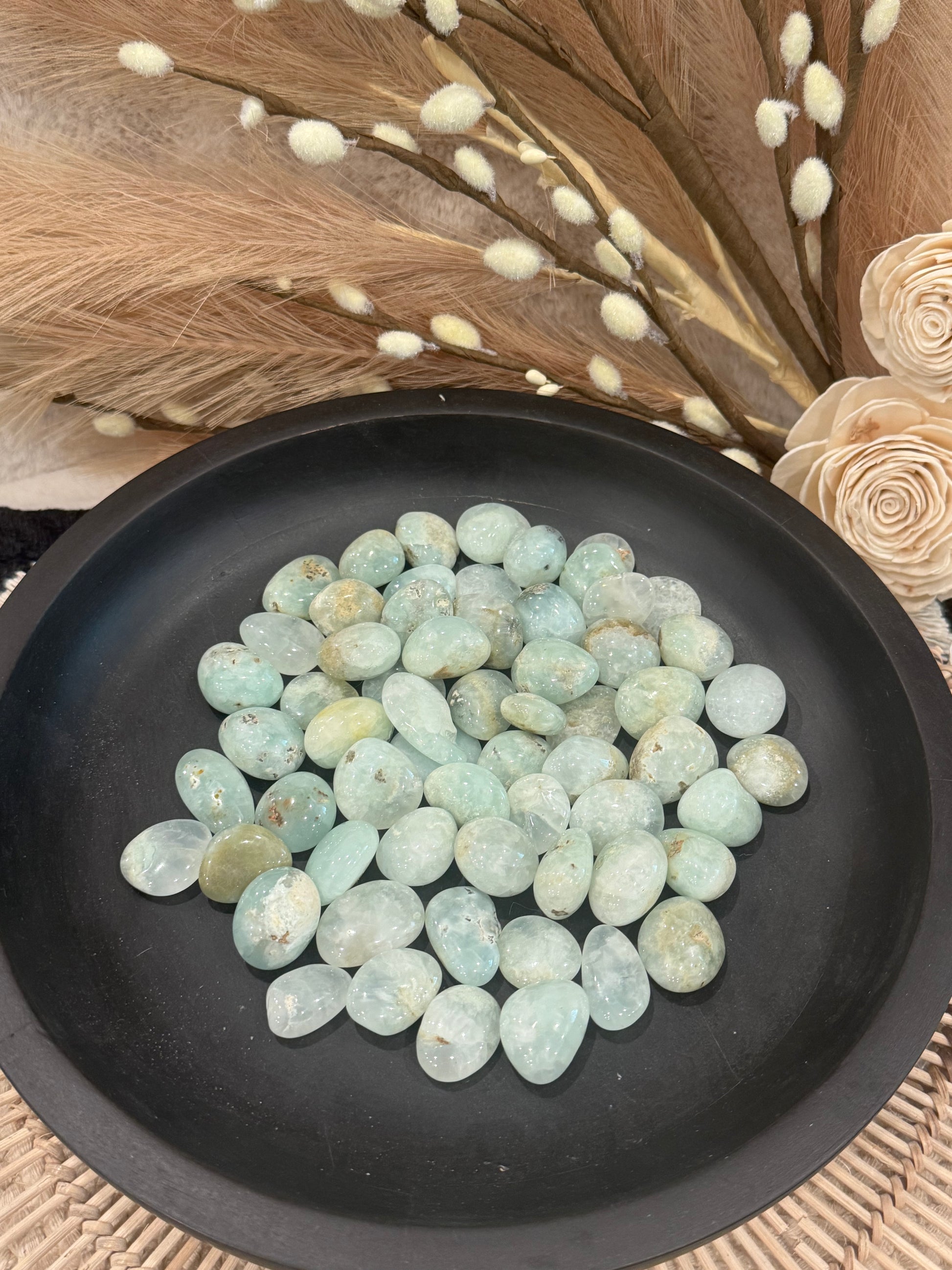 Blue Prehnite is a gentle, nurturing stone that opens both the heart and throat chakras, encouraging truthful expression and emotional clarity. Its soft, soothing energy helps ease anxious thoughts and supports those who feel deeply making it a favorite among empaths and healers. This beautiful tumbled version carries a peaceful, protective energy that helps you stay grounded while tuning into your inner voice.