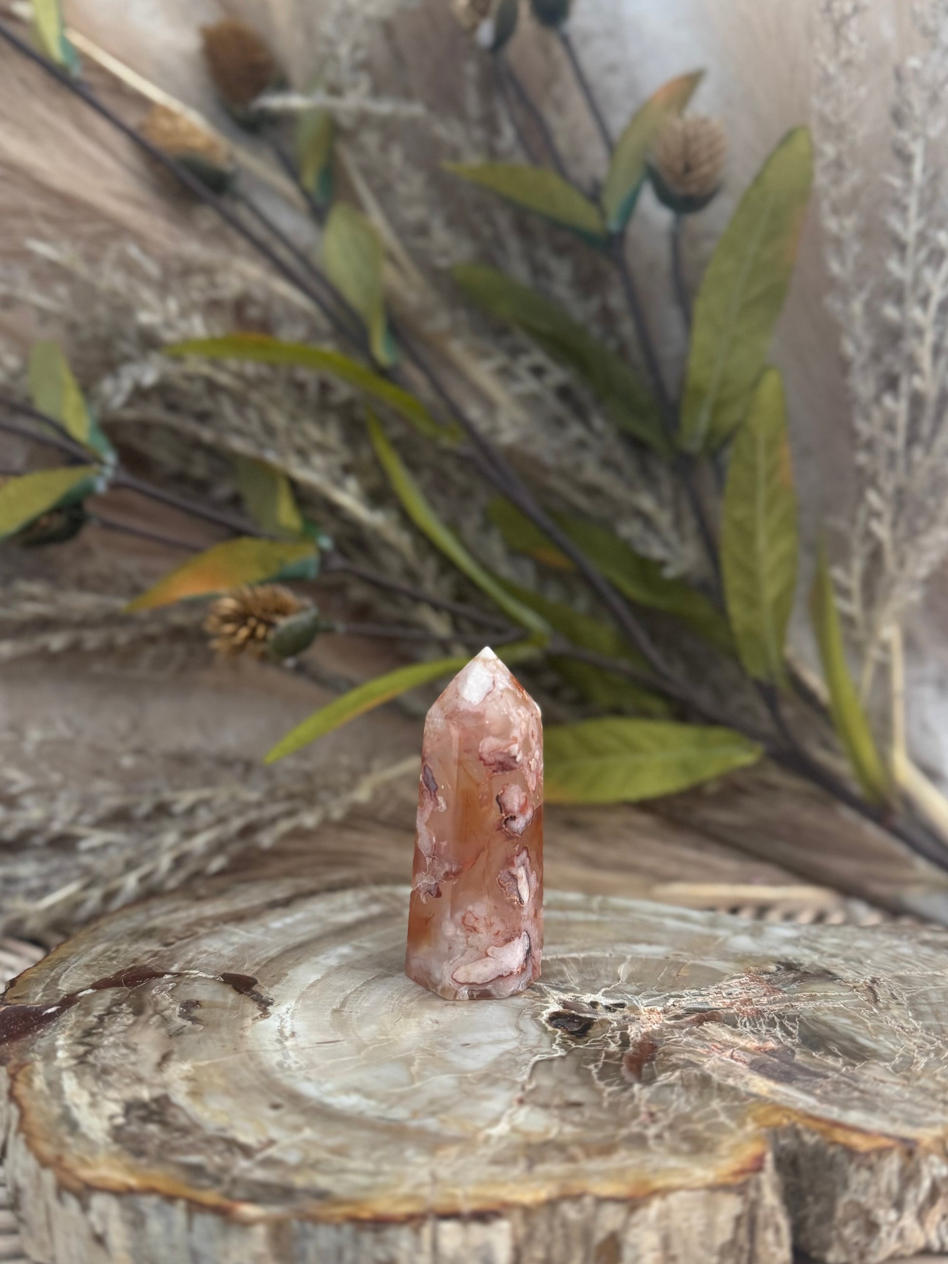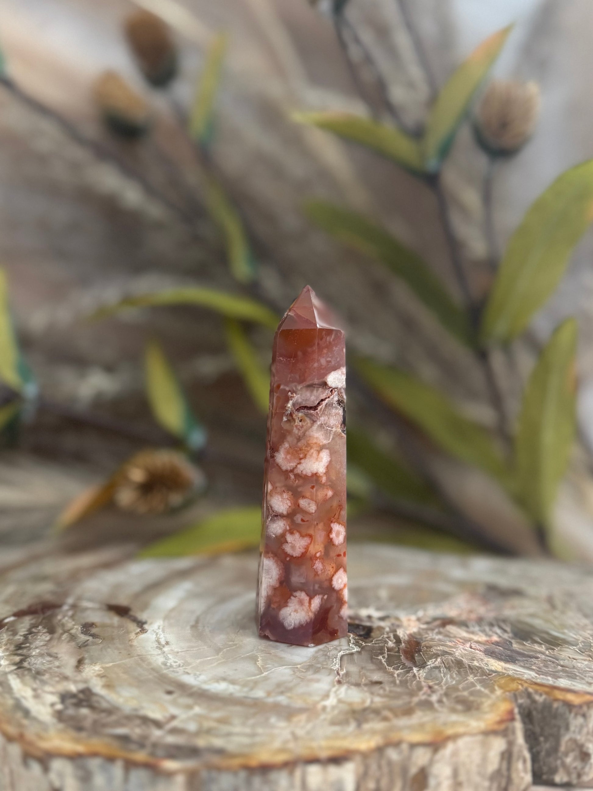 Incorporating a Carnelian Flower Agate Tower into your space or spiritual practice can provide a harmonious blend of energizing and nurturing energies, supporting both personal growth and emotional well-being.