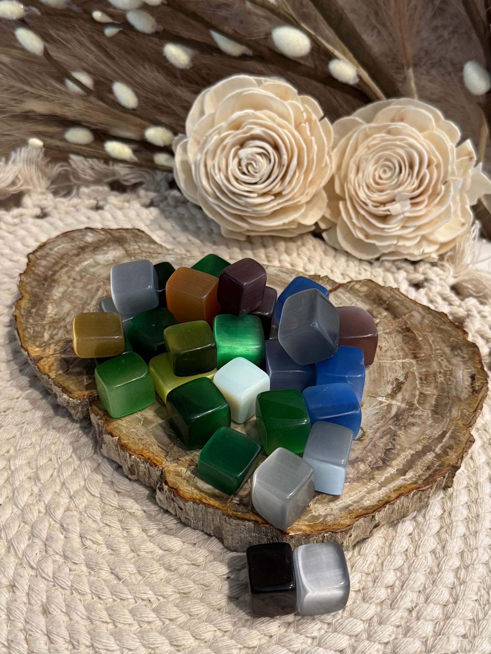These cubes are crafted from selenite that has been dyed to create their rich, vibrant colors, giving each one a mesmerizing appearance. Known for their balancing properties, Cat’s Eye Cubes are both visually captivating and energetically supportive.