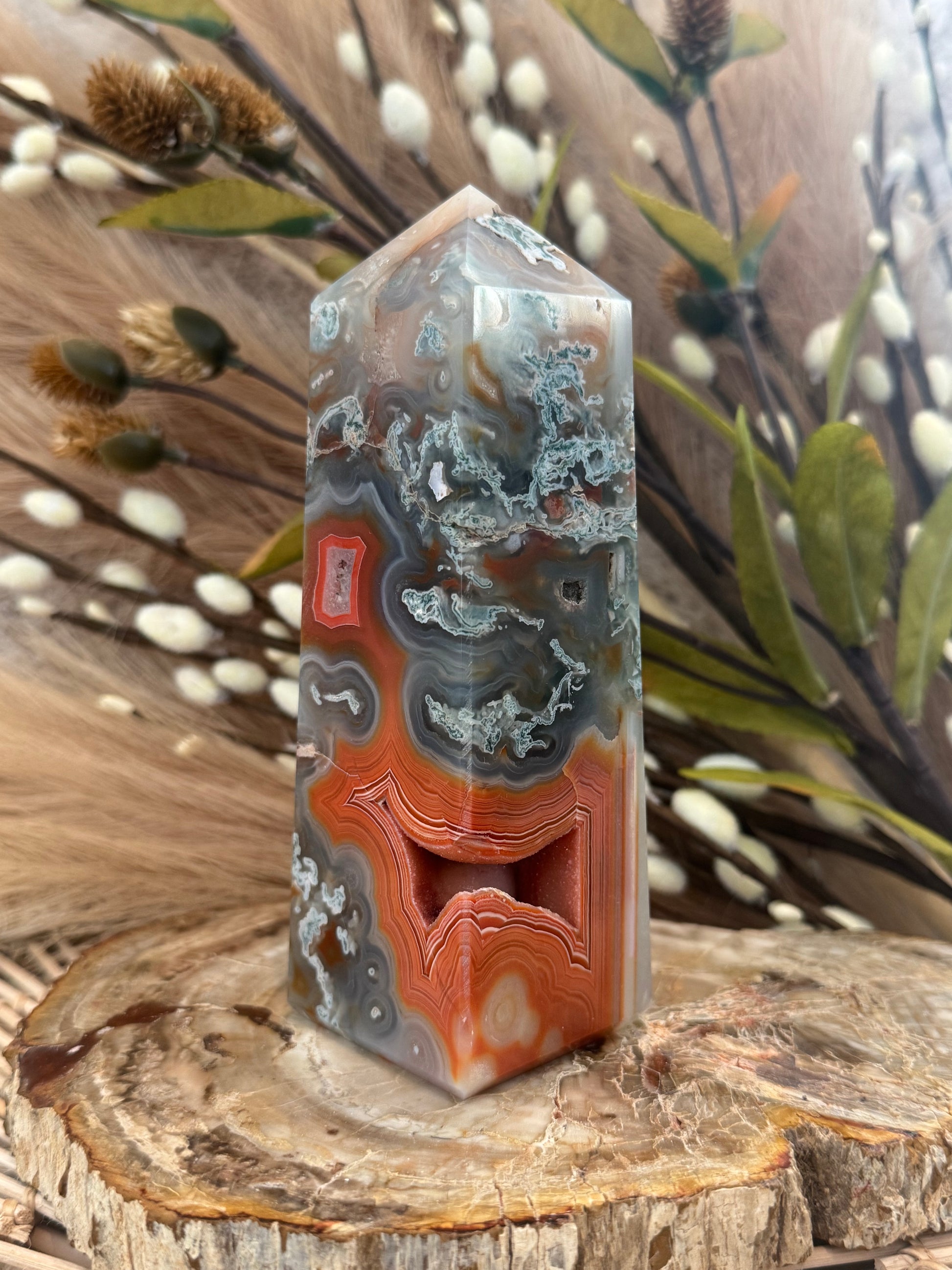 This stunning tower is a rare and radiant fusion of Carnelian and Moss Agate, enhanced by natural druzy crystal sparkle that adds an ethereal touch of magic. A beautiful blend of fiery motivation and earthy balance, this piece is as visually captivating as it is energetically powerful.