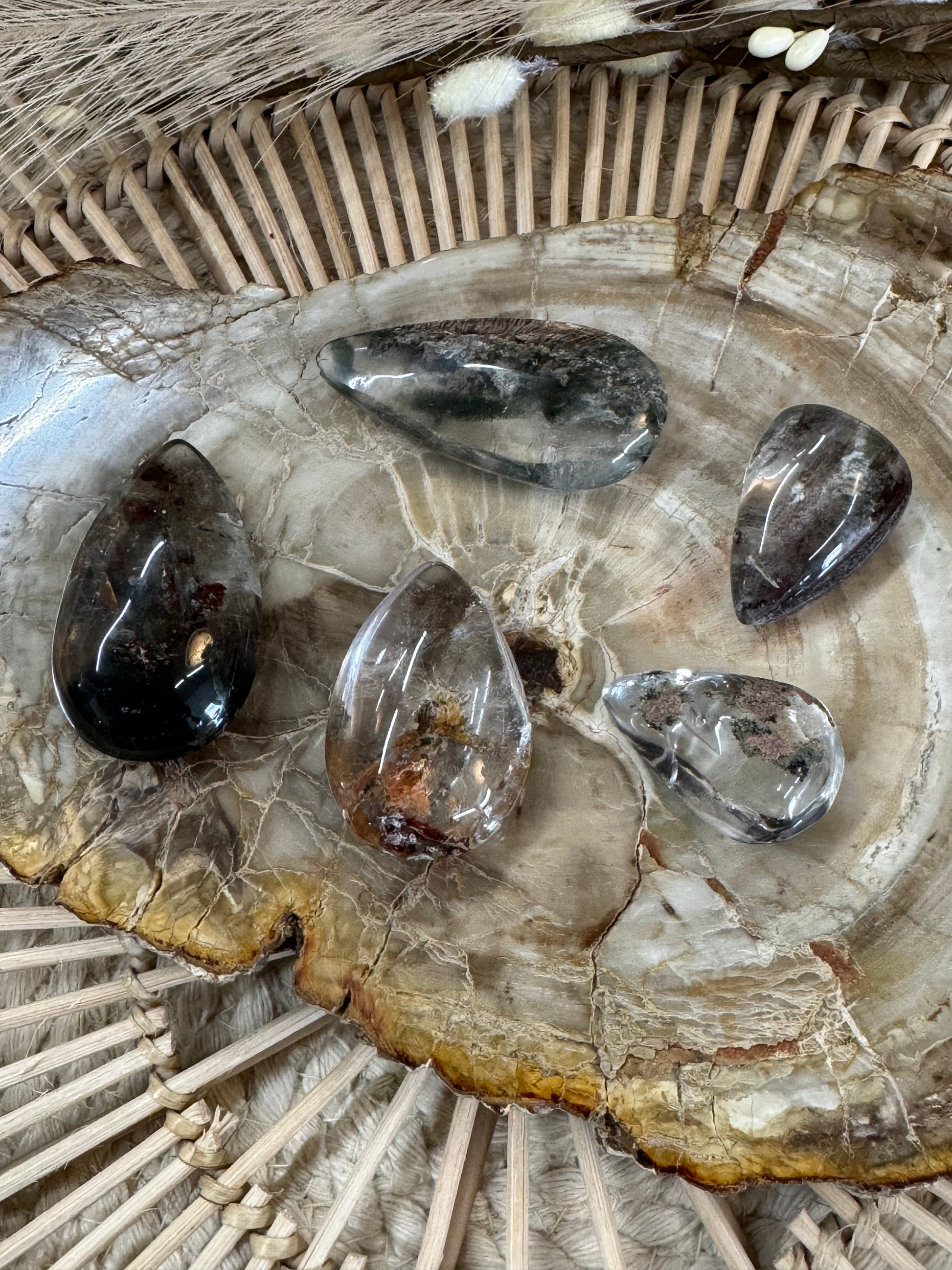 Garden Quartz, also known as Lodolite or Scenic Quartz, captures the essence of nature within its crystal-clear structure, and the Rain Drop variety resembles tiny drops of water suspended in the stone. Each piece is naturally unique, showcasing internal inclusions that look like miniature landscapes, gardens, or underwater scenes.