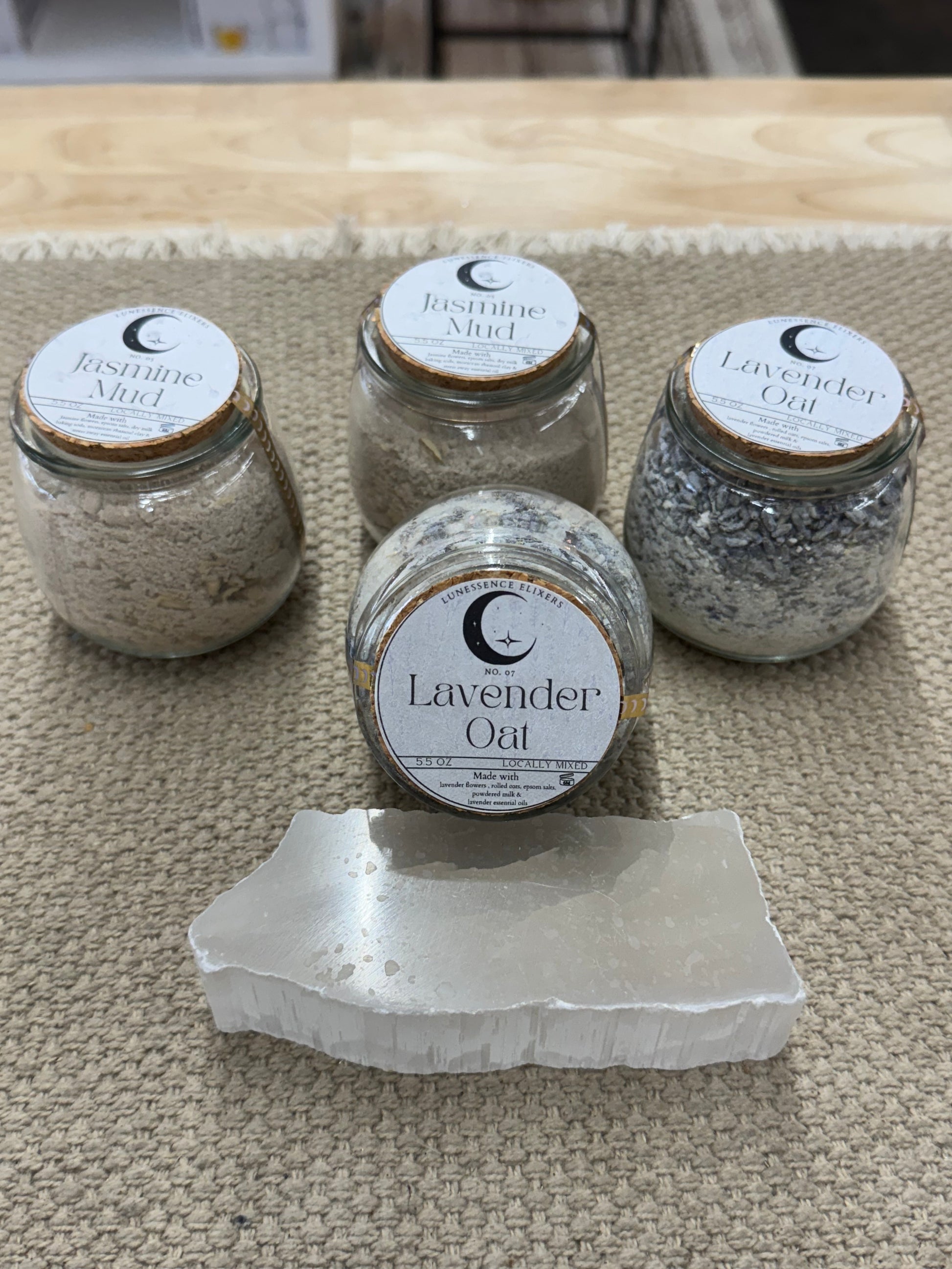• Jasmine Mud – A soothing blend of jasmine flowers, Epsom salts, dry milk, baking soda, Moroccan rhassoul clay, and Stress Away essential oils. This restorative mix helps release tension, soften the skin, and invite relaxation.