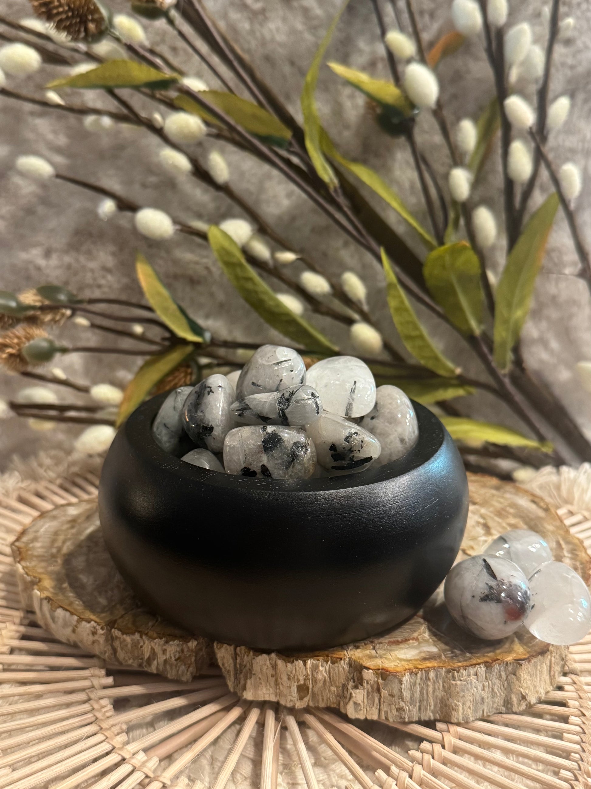 These polished Tourmalinated Quartz tumbled stones feature striking black tourmaline inclusions suspended within clear quartz, creating a captivating visual contrast. Each piece is unique, showcasing the harmonious blend of grounding and amplifying energies. The smooth, pocket-sized form makes them perfect for carrying, meditation, or placing in your sacred space.
