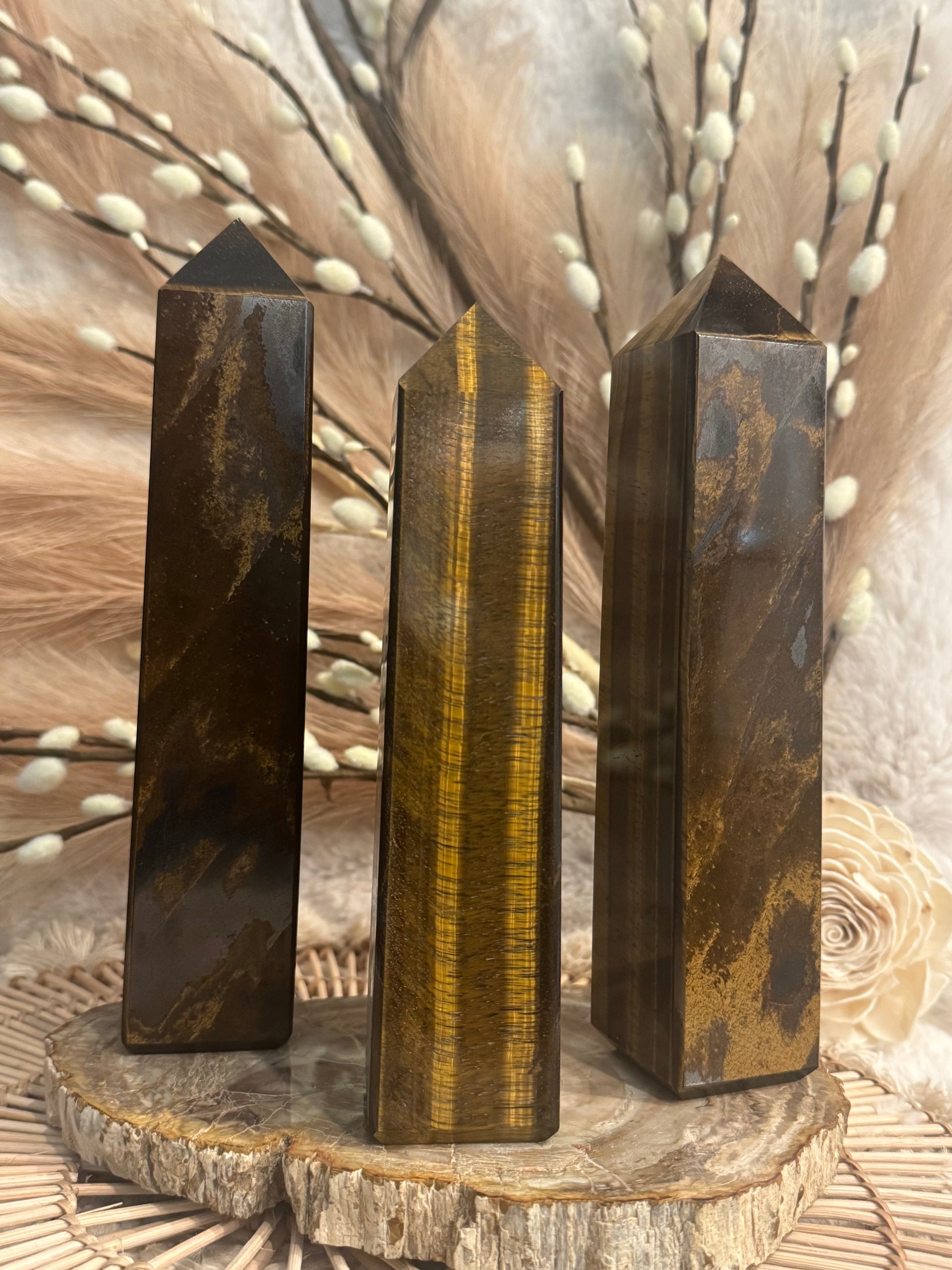 These Tiger Eye towers are perfect for your workspace, altar, or daily energy practice—helping you stand firm, think clearly, and shine with inner strength.