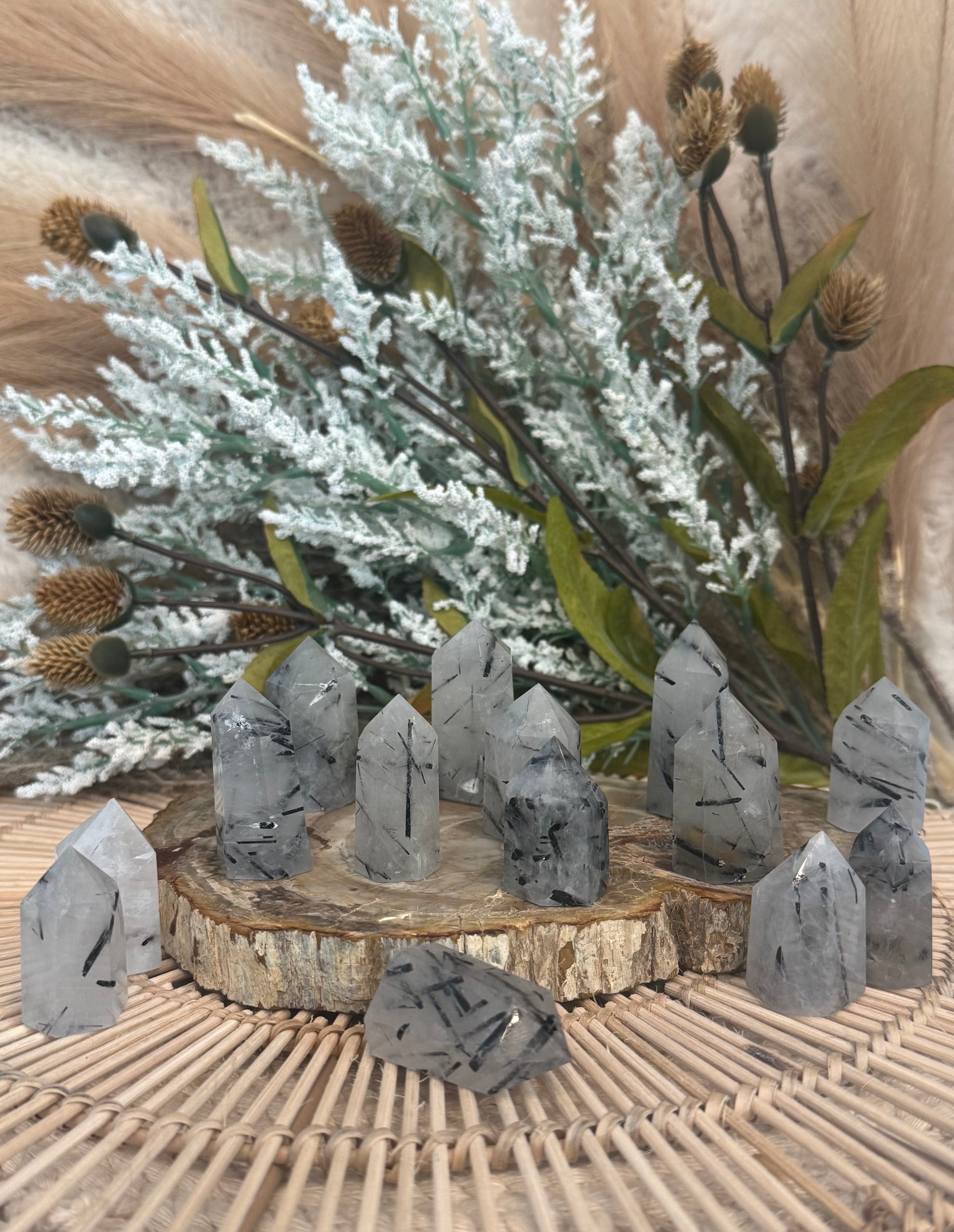 Tourmalinated Quartz is a captivating fusion of Clear Quartz and Black Tourmaline, combining the amplifying properties of Quartz with the protective qualities of Tourmaline. These mini towers, typically ranging from 1 to 2.5 inches in height, showcase striking black strands of Tourmaline embedded within the translucent Quartz, creating a visually appealing contrast.